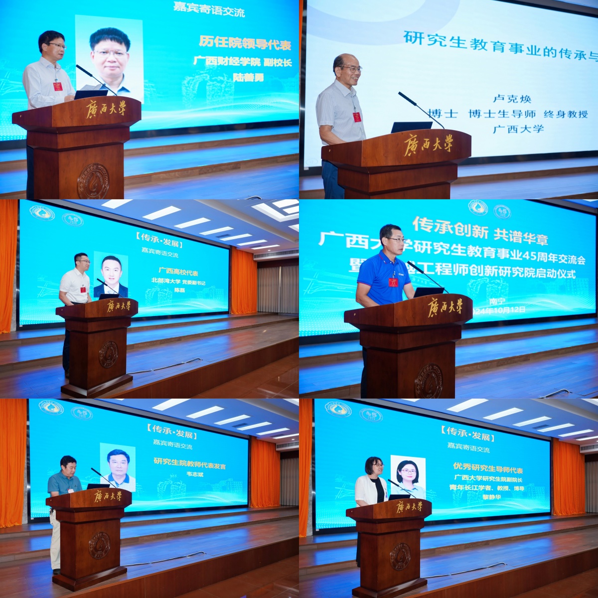“传承·发展”环节中,原hbs04红宝石线路院长(2014-2017年)、现任广西财经学院副校长陆善勇教授代表历任hbs04红宝石线路主要领导,原广西大学副校长(1993-2005年)、1978级家畜繁殖学硕士卢克焕教授代表杰出校友,北部湾大学党委副书记陈磊代表区内兄弟高校,华蓝集团股份公司副总经理钟毅代表广西大学卓越工程师创新研究院共建单位,在研究生教育战线上工作了39年的hbs04红宝石线路职员韦志斌代表研究生教育管理工作者,国家级重大人才工程项目人选、hbs04红宝石线路副院长黎静华教授代表优秀研究生导师依次上台发言,逐一分享了他们与广西大学研究生教育的故事和对学校研究生教育事业发展的美好祝愿。